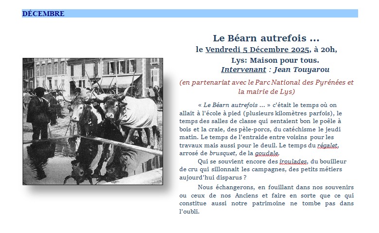 En fonction des possibilités, des sorties à thèmes sont organisées dans les domaines de l’archéologie, du pastoralisme, du patrimoine et des cultures populaires du Béarn.